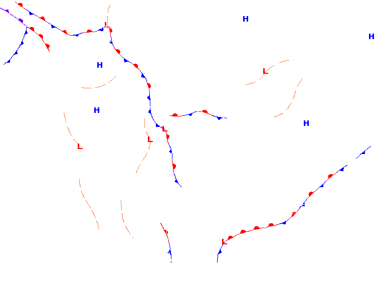 各種の前線(温暖前線、寒冷前線、停滞前線と閉塞前線)や、高気圧(H)および低気圧(L)が解析されています。