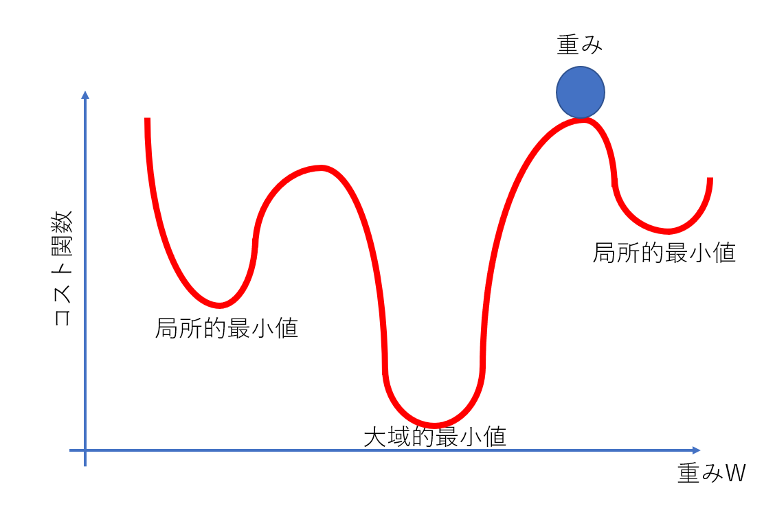 「誤差」はどの程度学習できているかの指標です。大きければ学習できておらず、小さいほど学習できています。誤差はコスト関数や損失関数と呼ばれますが、これは重みの値によって変化します。
