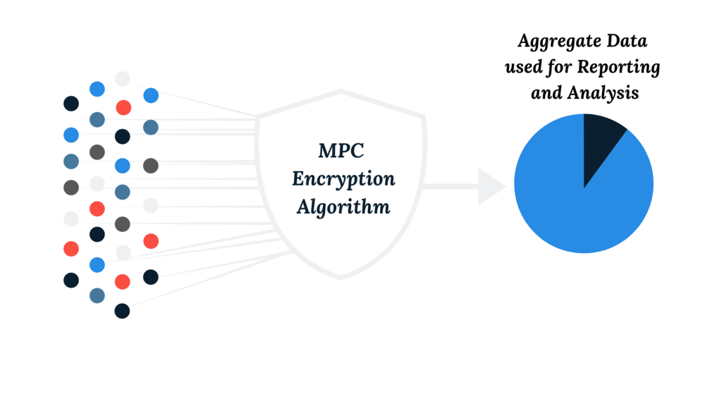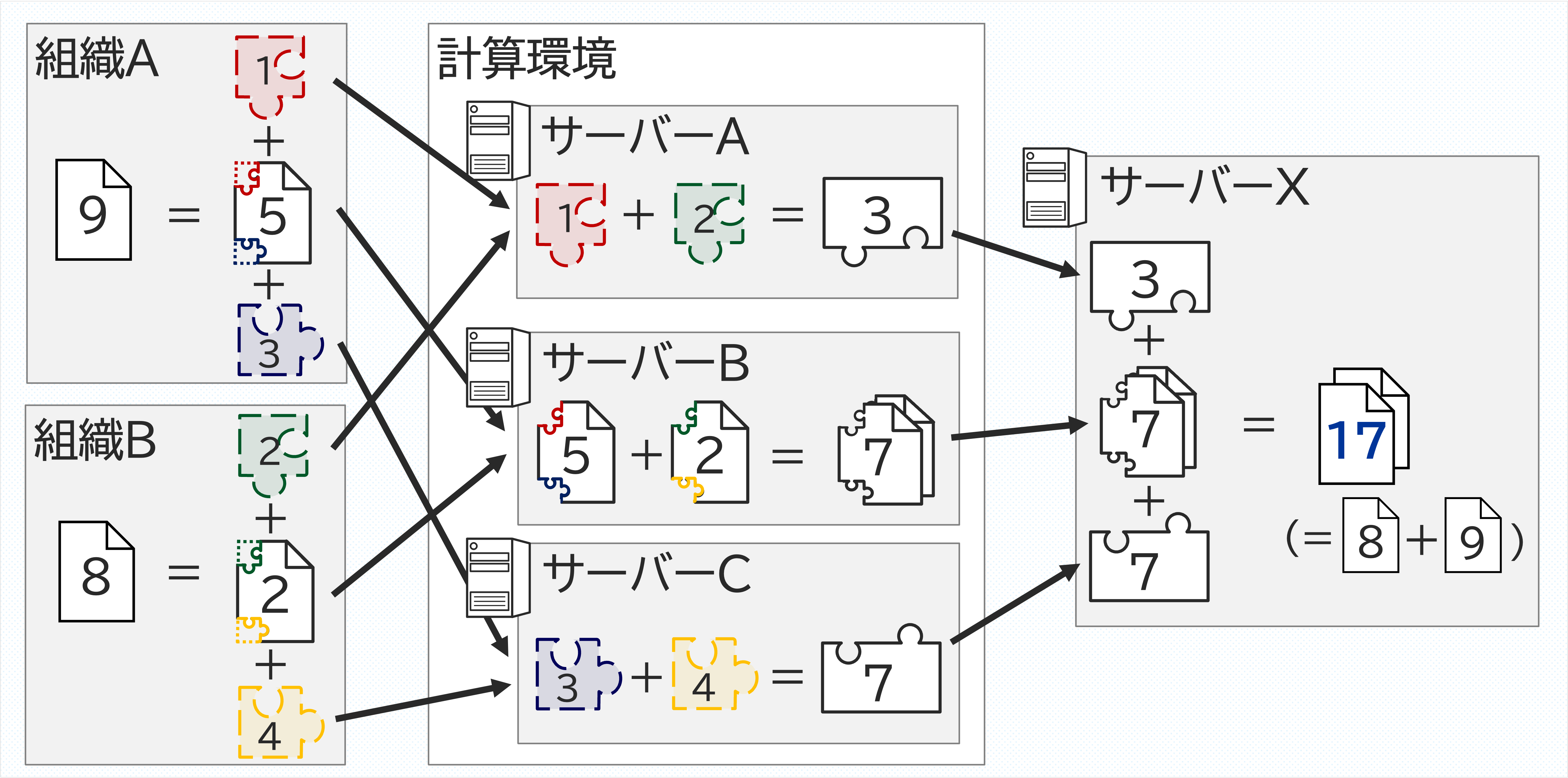 サーバーの管理者を分けることで、サーバーの管理者が結託しない限りデータの復元を困難にし、データを秘匿化したまま分析・処理を可能にしています。