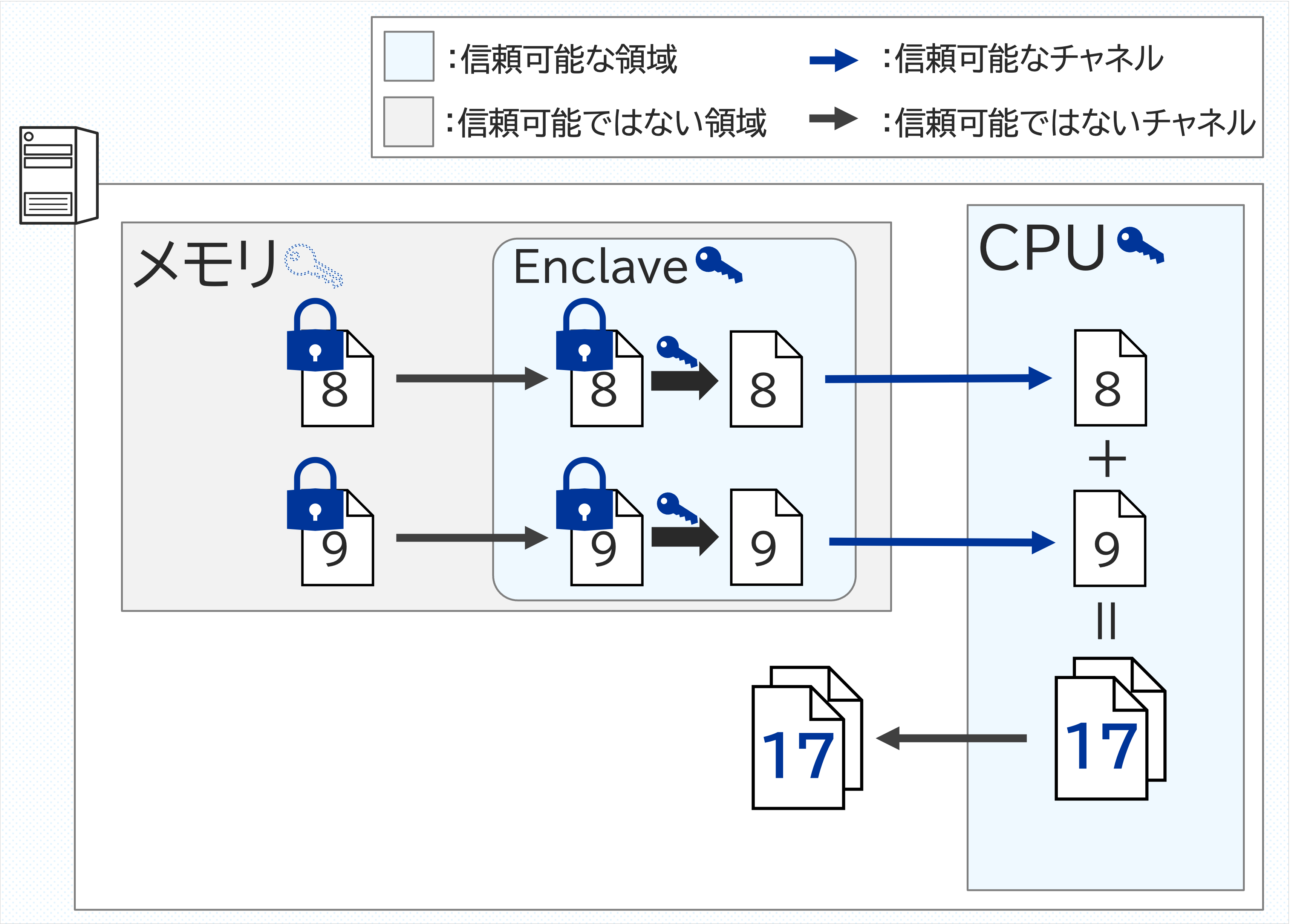 TEEとはTrusted Exectuion Environmentの略で、ハードウェア上に隔離される信頼可能な領域のことを指します。主な信頼可能な領域としては「CPU」、「メモリの一部領域」、「CPUと信頼可能なメモリ領域の間の通信路」であり、信頼可能な領域でのみ生のデータを処理することで、他領域やOSなどからデータを秘匿化する秘密計算の実現手法の一つとしても利用されています。