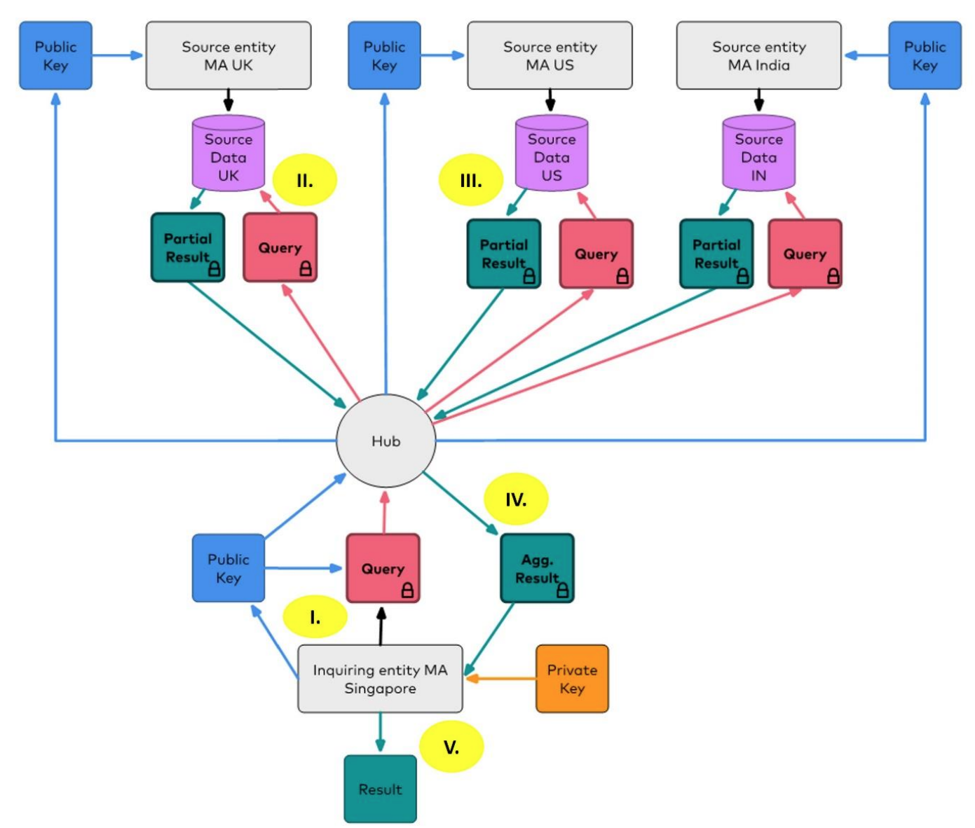 Mastercard社はシンガポールの情報通信メディア開発庁(IMDA)が運営しているプライバシー強化技術(PET)サンドボックスに参加し、完全準同型暗号(FHE)を使用して、国境を超えた金融犯罪情報の共有を促進する方法を実証しました。この実証実験にはランダムに生成されたテストデータが使用され、実際のデータは使われませんでした。実証実験の結果、複数のデータストアから疑わしい口座を特定することができ、FHEを使用したプロセス全体がデータ保護法の遵守にプラスの影響を与えることが分かりました。