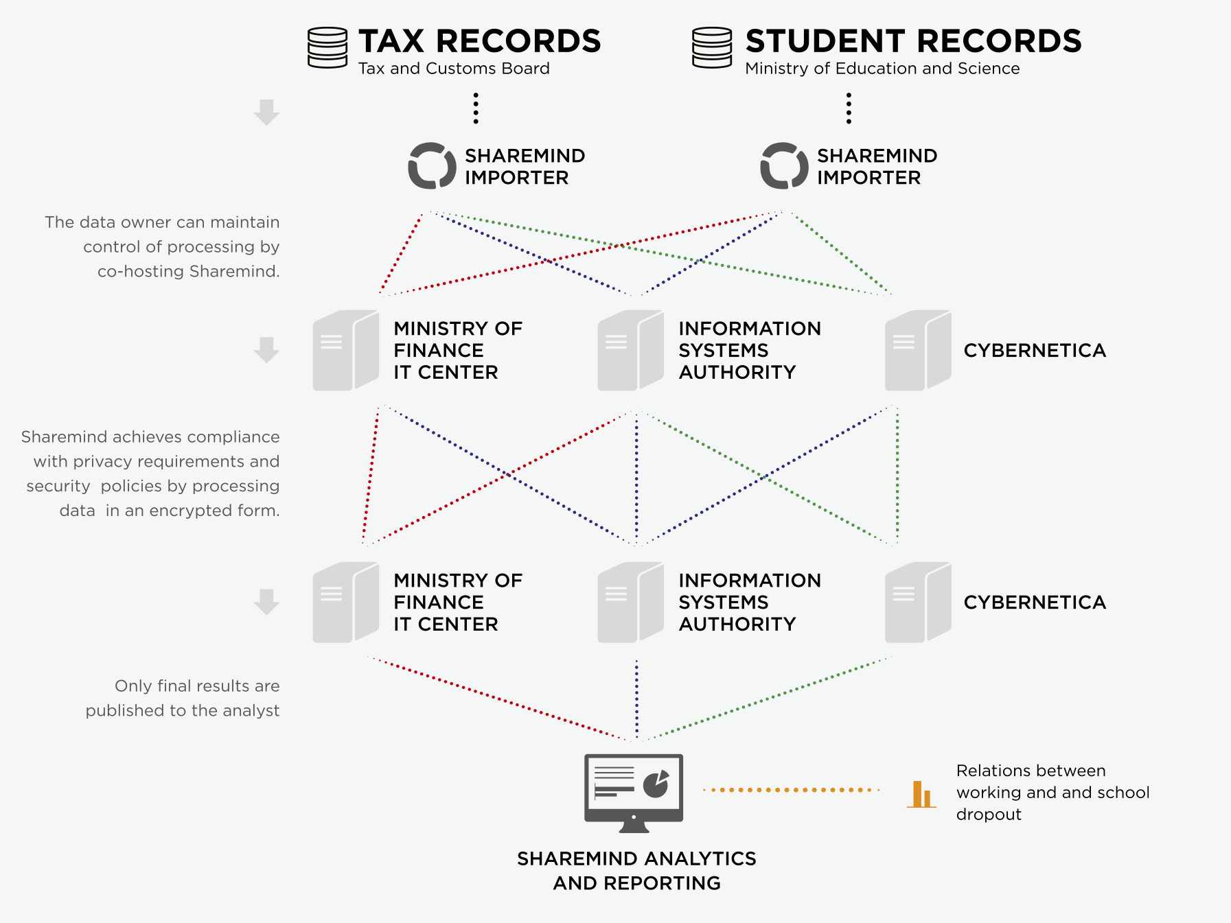 従来の匿名化技術ではデータが偏ってしまう、サンプル数が減少してしまうという問題がありましたが、MPCを利用することで、データを秘匿化した状態で正確な分析が可能になりました。この研究はエストニア税務関税庁が保有する個人納税額データベースと、教育研究省が保有する高等教育データベースを用いて行われています。