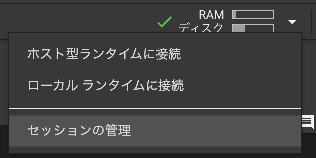 ↑を実行する前に既にpipでmecab-python3の最新版をインストールしてしまっている場合は、一度colabのセッションを再接続するのをお忘れなく。セッションの切断の仕方はcolab画面の右上のRAMとかディスクとか書いてる▼をクリックして、セッションの管理から行えます。