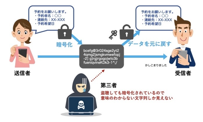 しかし、この中身が第三者に見られてしまうと、個人情報を流出することになり、取り返しのつかない被害を受ける可能性があります。そうしたことがないよう、やり取りするメッセージを暗号化する技術が使われています。中でも代表的な暗号方式として、公開鍵暗号方式と共通鍵暗号方式があります。