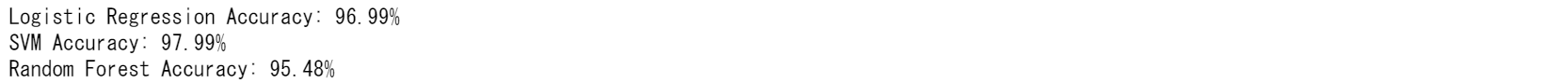 ロジスティック回帰、サポートベクターマシン(SVM)、ランダムフォレストのモデルの精度を比較します。