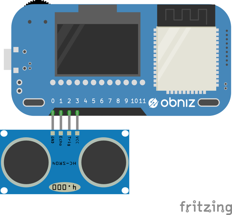 超音波距離センサ「HC-SR04」をObnizに接続します。gnd, echo, trigger, vcc のピンが、それぞれ指定された番号に対応して接続されます。