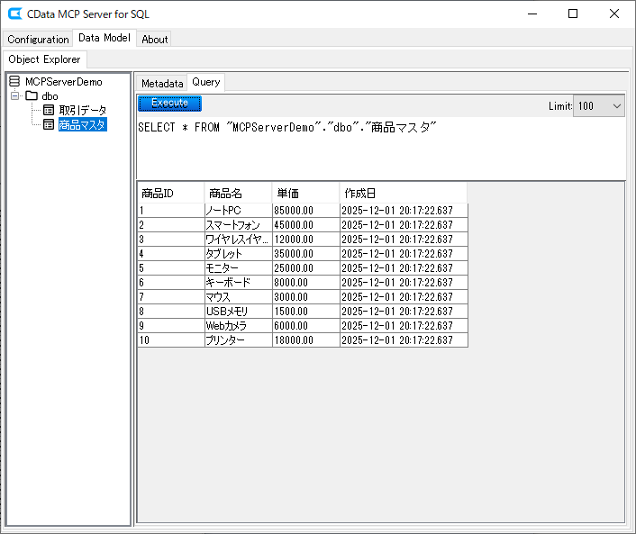 今回は、デモ用として、取引データと商品マスタという2つのテーブルにデータを入れてあります。