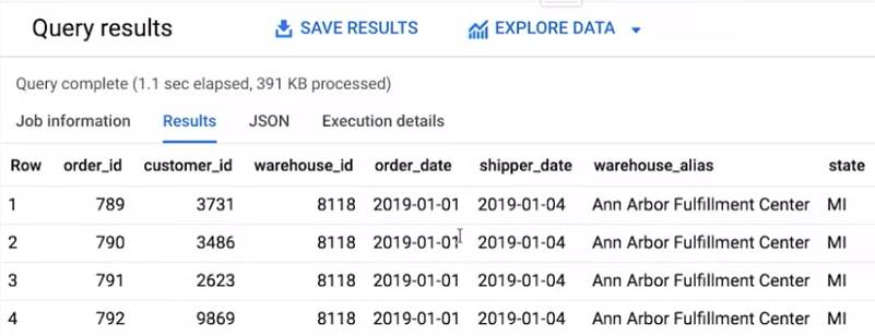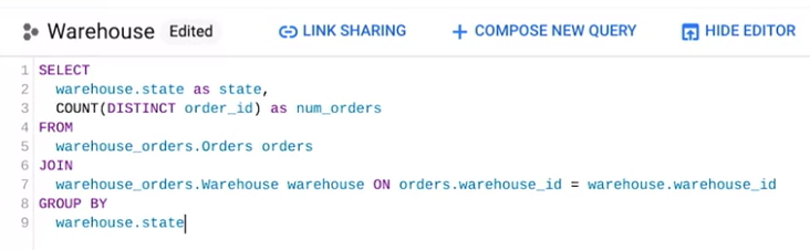 ここでは、州ごとの受注状況を レポートするために、 倉庫の詳細と受注の詳細の 両方が必要だとします。 そこで、この 2 つのテーブルを JOIN して 両方のデータを取得します。 ここで warehouse テーブルのエイリアスも 作成しておきましょう。 この場合、両方のテーブルに 対応するデータが必要なので JOIN は INNER JOIN の略語として使用します。