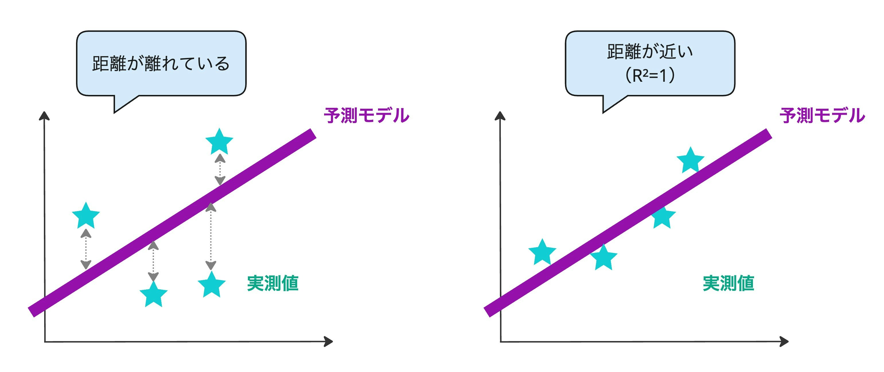 • R²の値が1に近いと、モデルがデータ(のすべての変動)をよく説明していることになります。