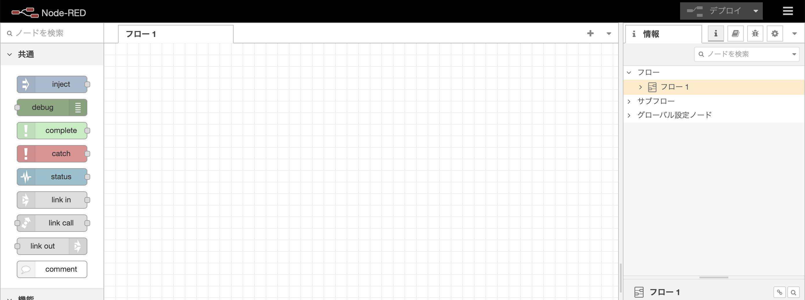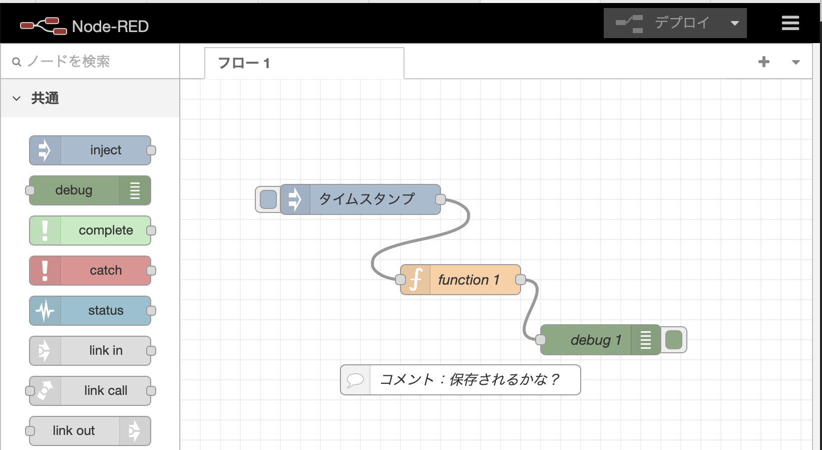 Node-RED チュートリアルの Your First Flowのようなフローをつくってデプロイしてみます。