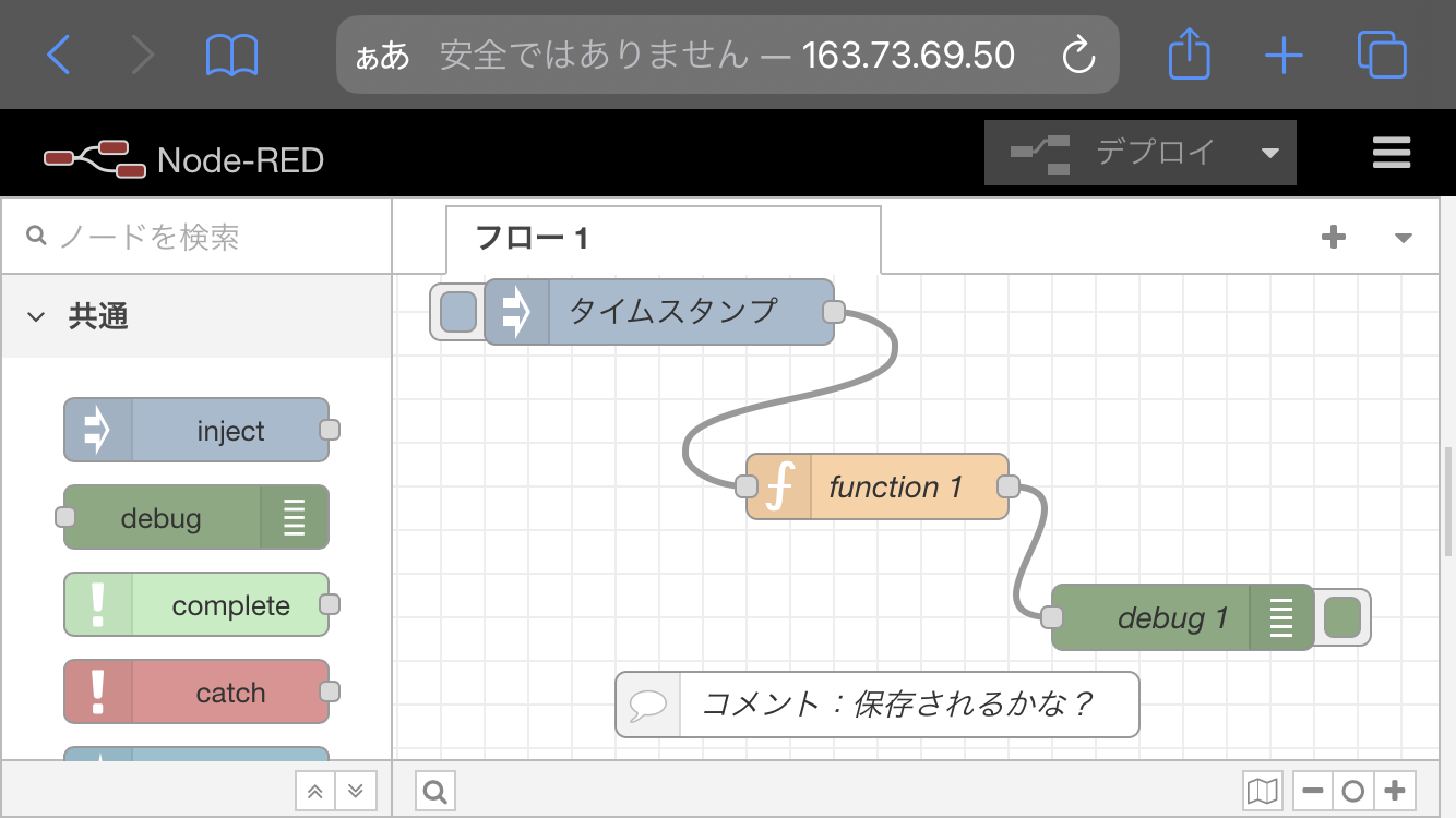 - 再び Node-RED にアクセスしてみます。念のため別の端末からアクセスしてみましたが、フローは保存され、永続化されていました。