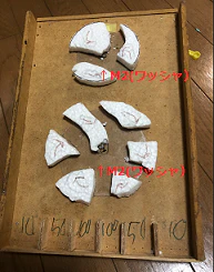 下側には、球が入賞する仕切り板をベニア板で作り木工用ボンドにより接着します。そして、入賞点数を書いておきます。うちの子は、10点、50点、100点、100点、50点、10点としてました。