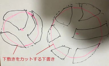 まず、下敷きから切り出す小さな円と大きな円を下の図のピンクの線のように下書きします。次に下敷きの円より一回り大きな円に沿って、発泡スチロール板の球の進路を邪魔する線を適当に下書きします。下書きに沿って、それぞれカッターなどでくり抜いていきます。うちの子は下のように球が分岐する感じで切り出していました。