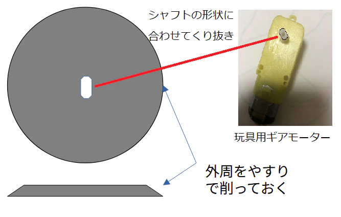 このとき下敷きから切り出した円形の中央には、玩具用ギアモーターのシャフトの形状に合わせてくり抜いておきます。また、ダイヤモンドやすりで円形に切り出した外周の縁を図のように削っておきます。理由は、球が外周でつっかえないよう、スムーズに外周を乗り越えられるように少し削ります。