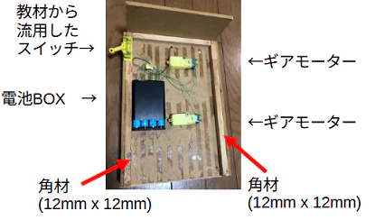 それでは取り付けたギアモーターと電池BOXを電線で接続し、断線しないようにハンダ付けし、ショートしないように熱収縮チューブやビニテで絶縁しておきます。電池BOXは、両面テープでベース板に固定し、ネジ(M2 x 4mmなど)でも固定しておくと安心です。また、もしスイッチがあれば便利です。下の図のように、たしか上の子の中学の授業で使ったスイッチを流用してつけています。