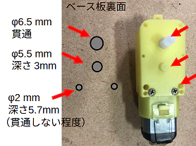 ベース板の裏面からあけた穴に合わせてギアモーターを取り付け穴をあけていきます。このギアモーターだと、取付用の穴が2か所にあいているのでM2.6 x 長さ25mmのネジを使用して固定します。M2.6のネジより一回り小さなφ2mmのドリルで表面に貫通しない程度に穴をあけます。また、ギアモーター中央に突起物があるためΦ5.5mmのドリルで3mm程度のあなをあけます。大小2つの回転体分の穴をあけたら両面テープで固定し、M2.6のネジでワッシャを適当に入れてドライバでねじ切りながら固定します。ネジのほうが穴よりも長い場合には、ワッシャを追加して調整します。