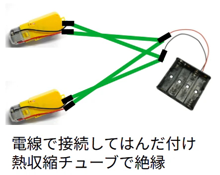 乾電池やモーターの配線ミスによる発熱やショートに注意してください。長時間使用しないときは電池を抜くようにしてください。