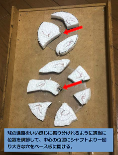 そして、切り出した下敷きの円形に発泡スチロールを両面テープで接着すると、球の進路を振り分ける回転体の完成です。