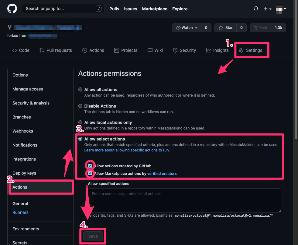 - GitHubでActionsを設定したリポジトリをforkした場合、デフォルト設定ではアクションは不許可になっています。