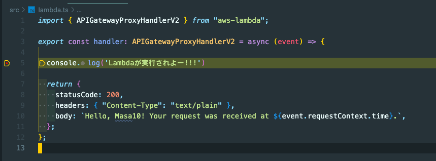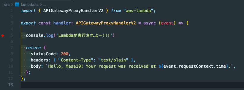 + body: `Hello, Masa10! Your request was received at ${event.requestContext.time}.`,