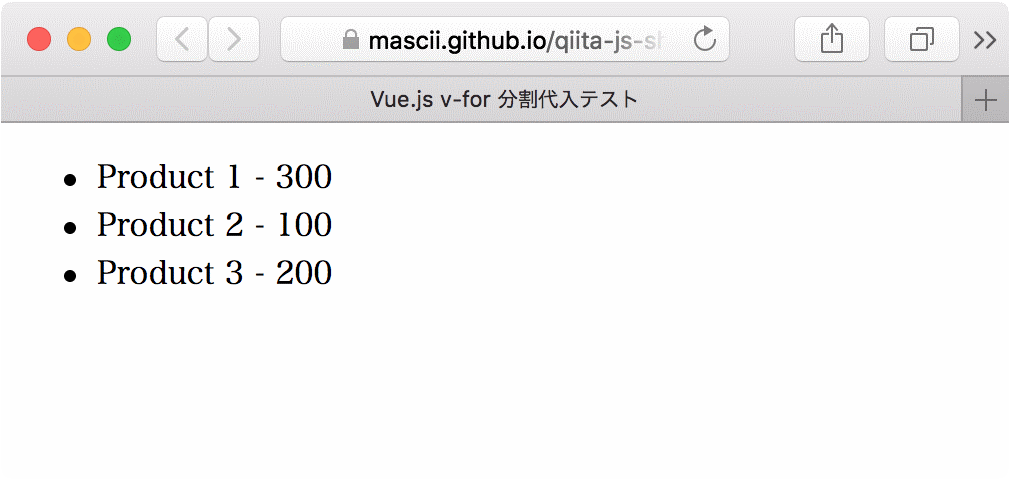 <title>Vue.js v-for 分割代入テスト</title>