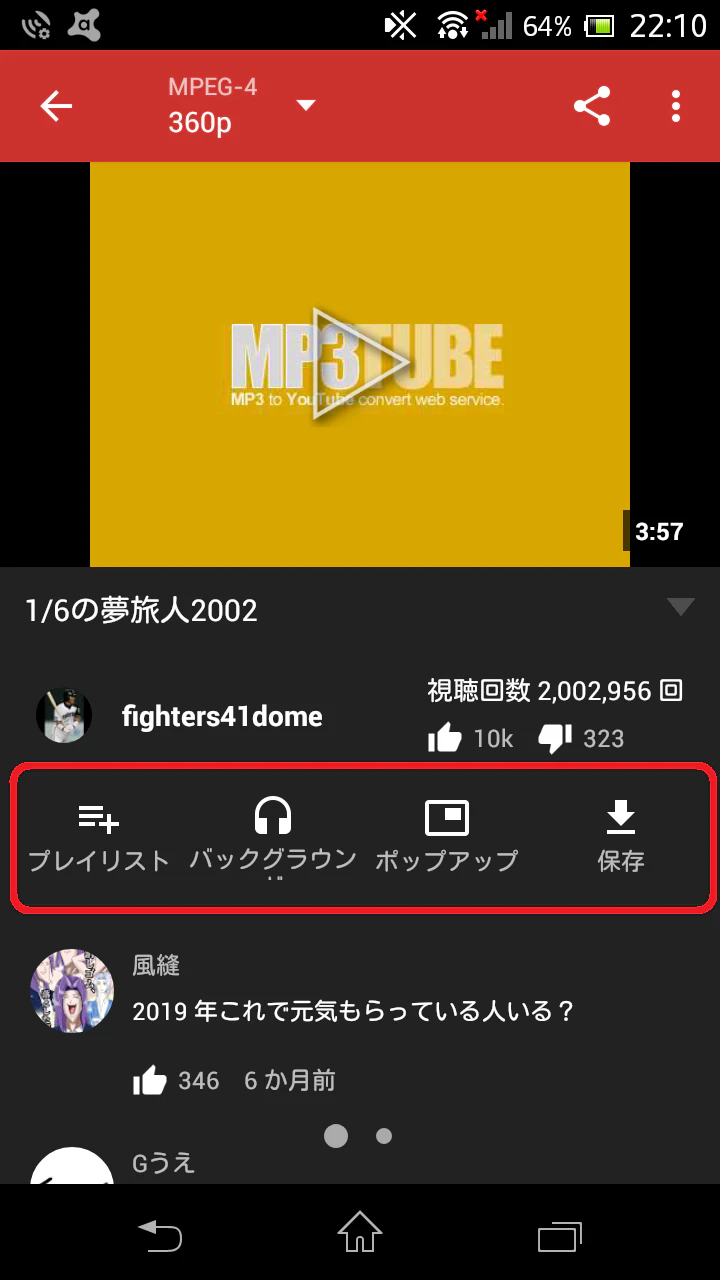 画面はこんな感じです。再生画面で、バックグラウンド再生やダウンロードの機能を実行することができます(赤枠の部分)。