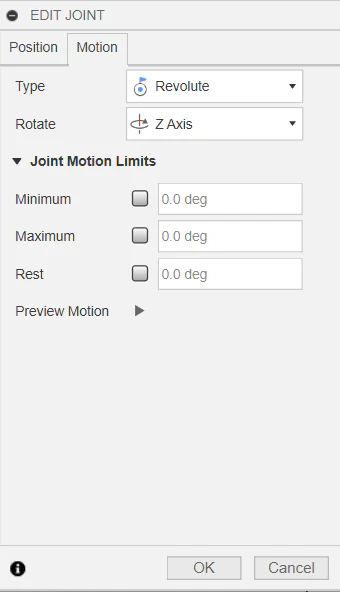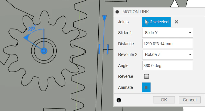 先ほど設定したジョイント2つを選択し、パラメータを入力。Distanceは、何を指しているか分かりづらいですが、ピニオン1回転あたりのラックの移動距離です。今回は、歯数12、モジュール0.8のため、12×0.8×3.14mmが1回転の移動距離となります。