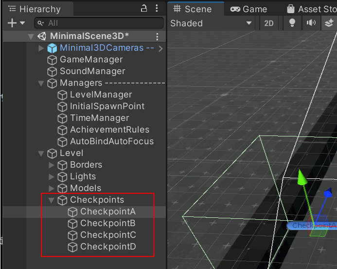 4箇所のチェックポイント(CheckpointA~D)を設置し、キャラクターがチェックポイントに進入するとそのチェックポイントに進入した実績が解除されるルールで作ります。AchievementIDはVisitCheckpointA~Dにしました