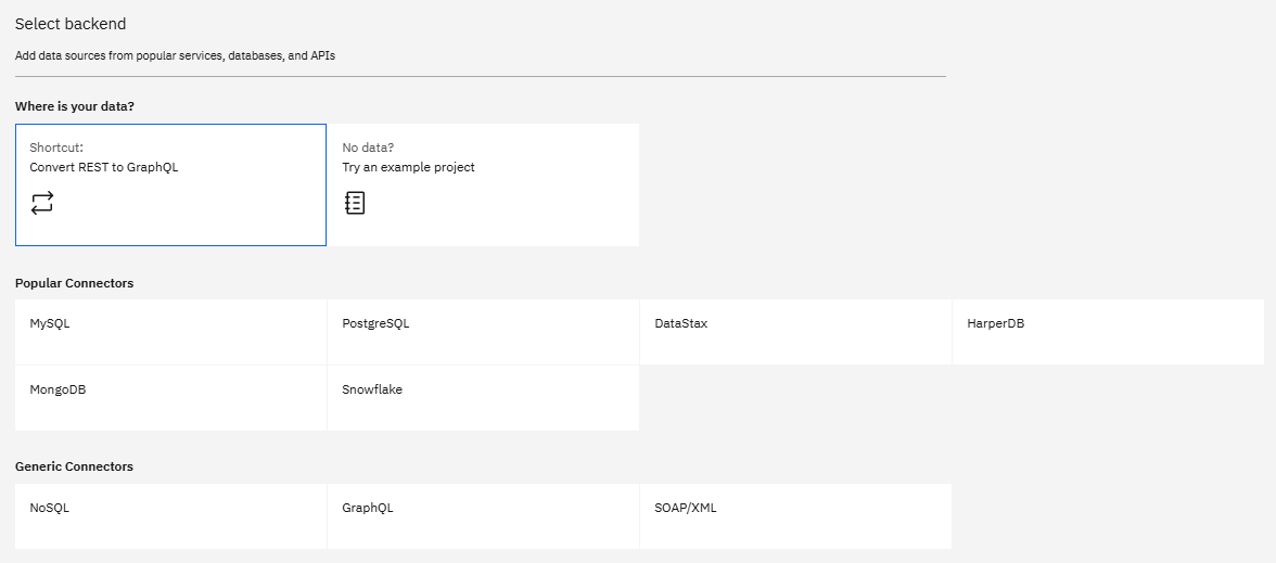 接続するバックエンドの種類を選択します。様々な接続の選択肢がありますが、ここでは「Convert REST to GraphQL」を選択します。