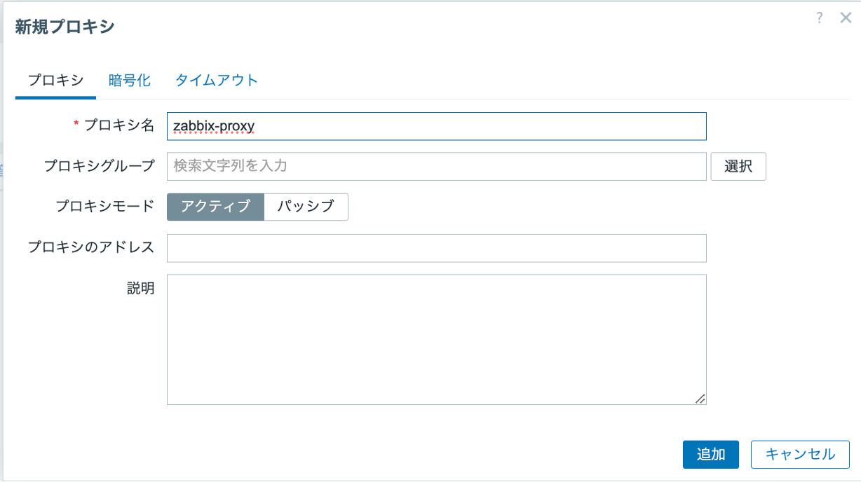 管理>プロキシ>プロキシの作成 をクリックして、Zabbix-Proxyを追加します。