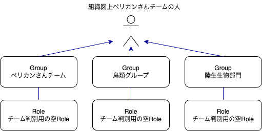 今回の権限設計では、組織図上でペリカンさんチームになっているメンバーを「ペリカンさんチームGroup」に入れて、そのGroupに対して「チーム判別Role」と命名したロールを割り当てています。(※注1)