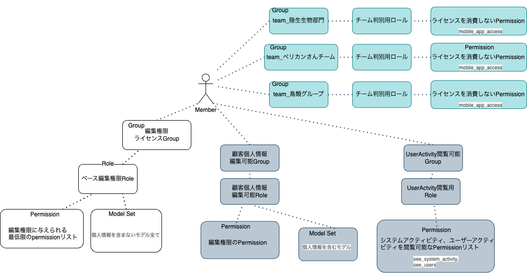 ごちゃごちゃしてきたのでGroup, Role, Permission, Modelを図にしてまとめると以下のようになります