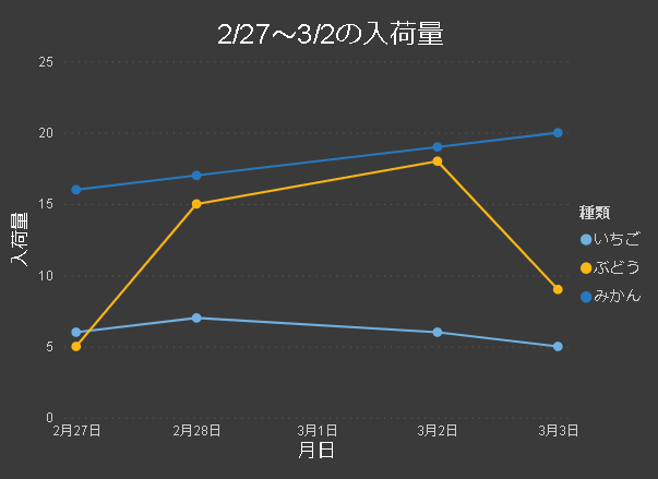 以下のようなデータ”入荷量.csv”を使ってPowerBIの折れ線グラフを表示させる。
