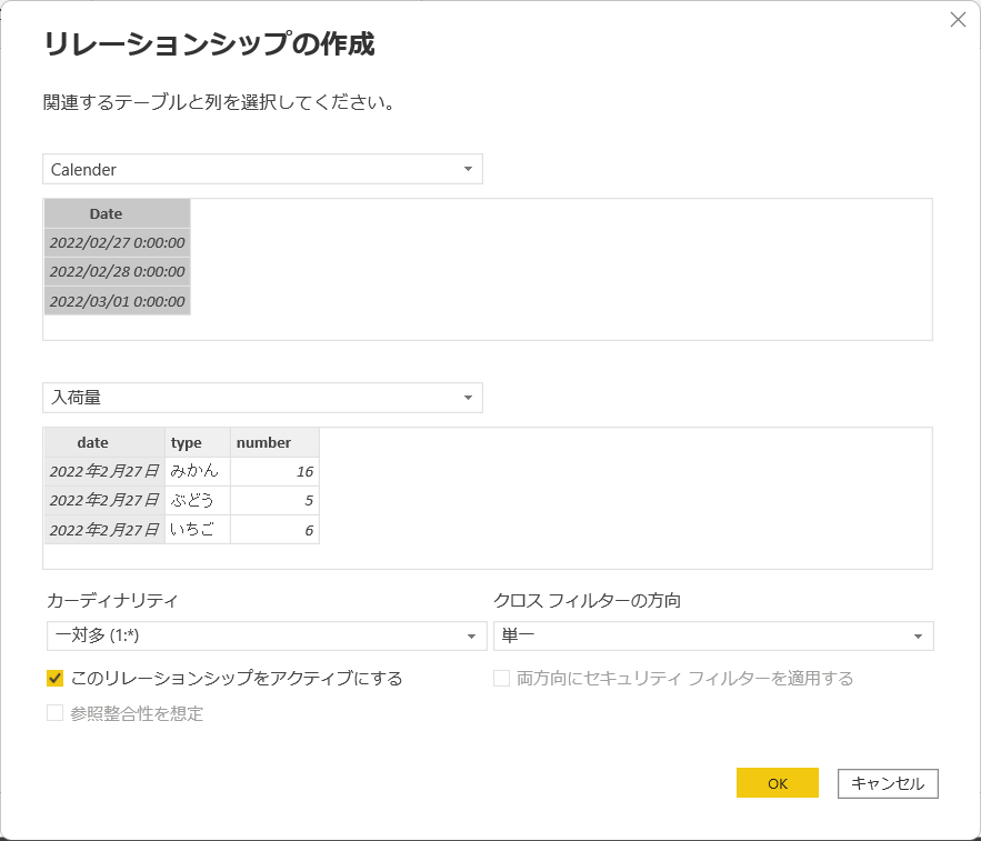 カレンダーテーブルのDateカラムをクリックすると、自動的にカーディナリティなどが設定される。