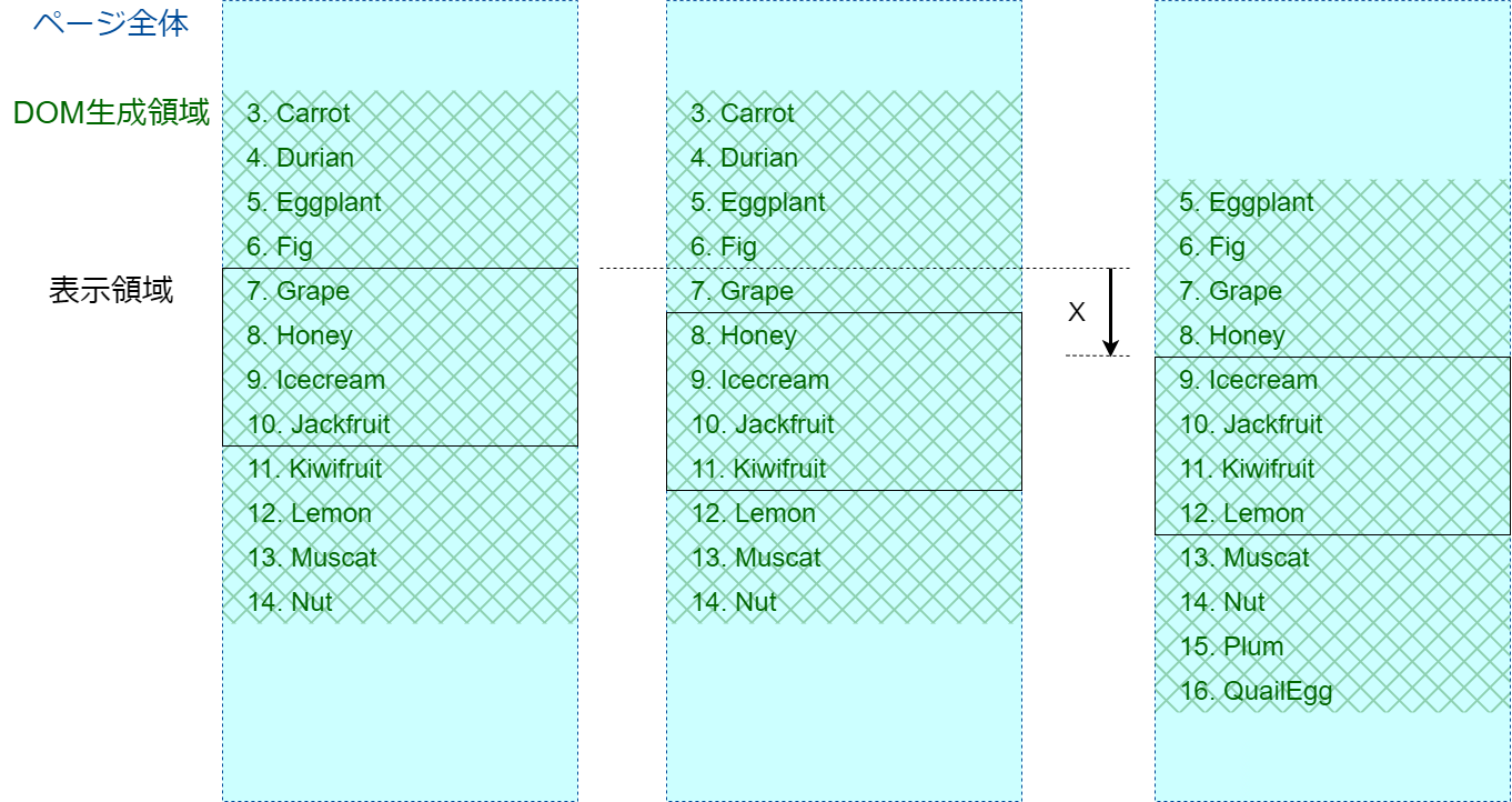 ・表示領域の高さを2Xとし、表示領域の上下2Xずつ、計6XのDOMを常に用意する。