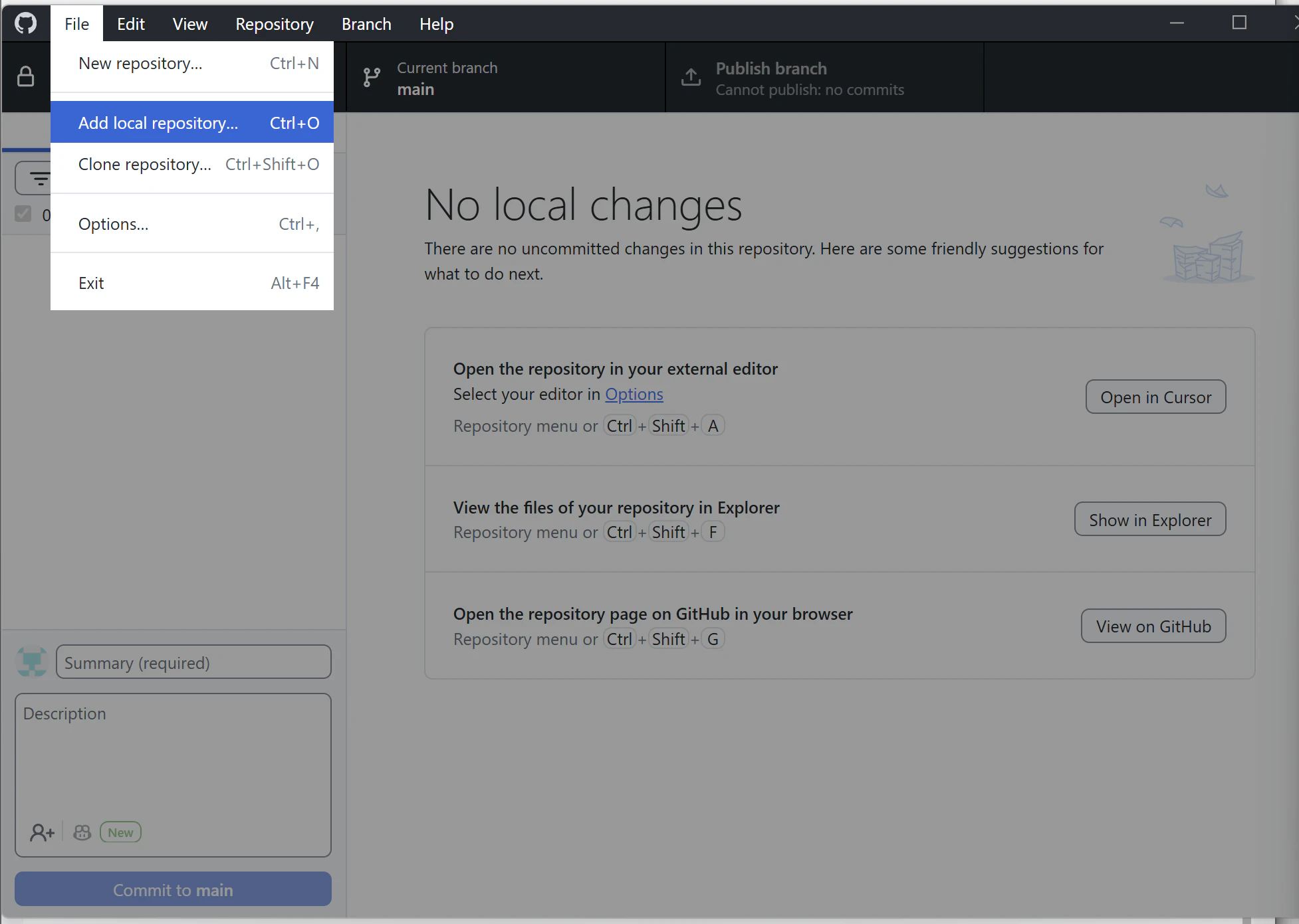 4. GitHub Desktop でリポジトリを作成 → commit → Publish(push) する(初回だけ)