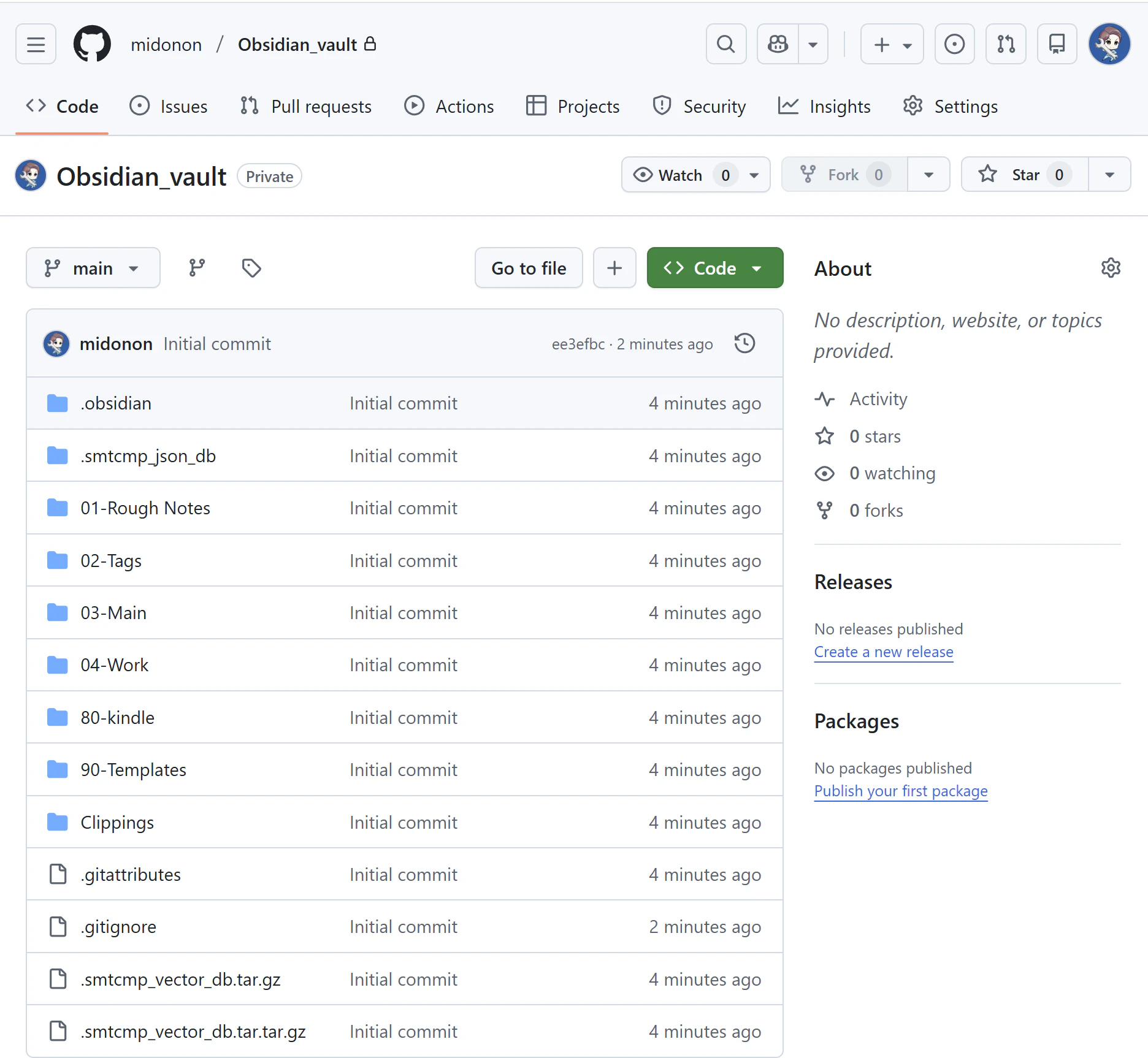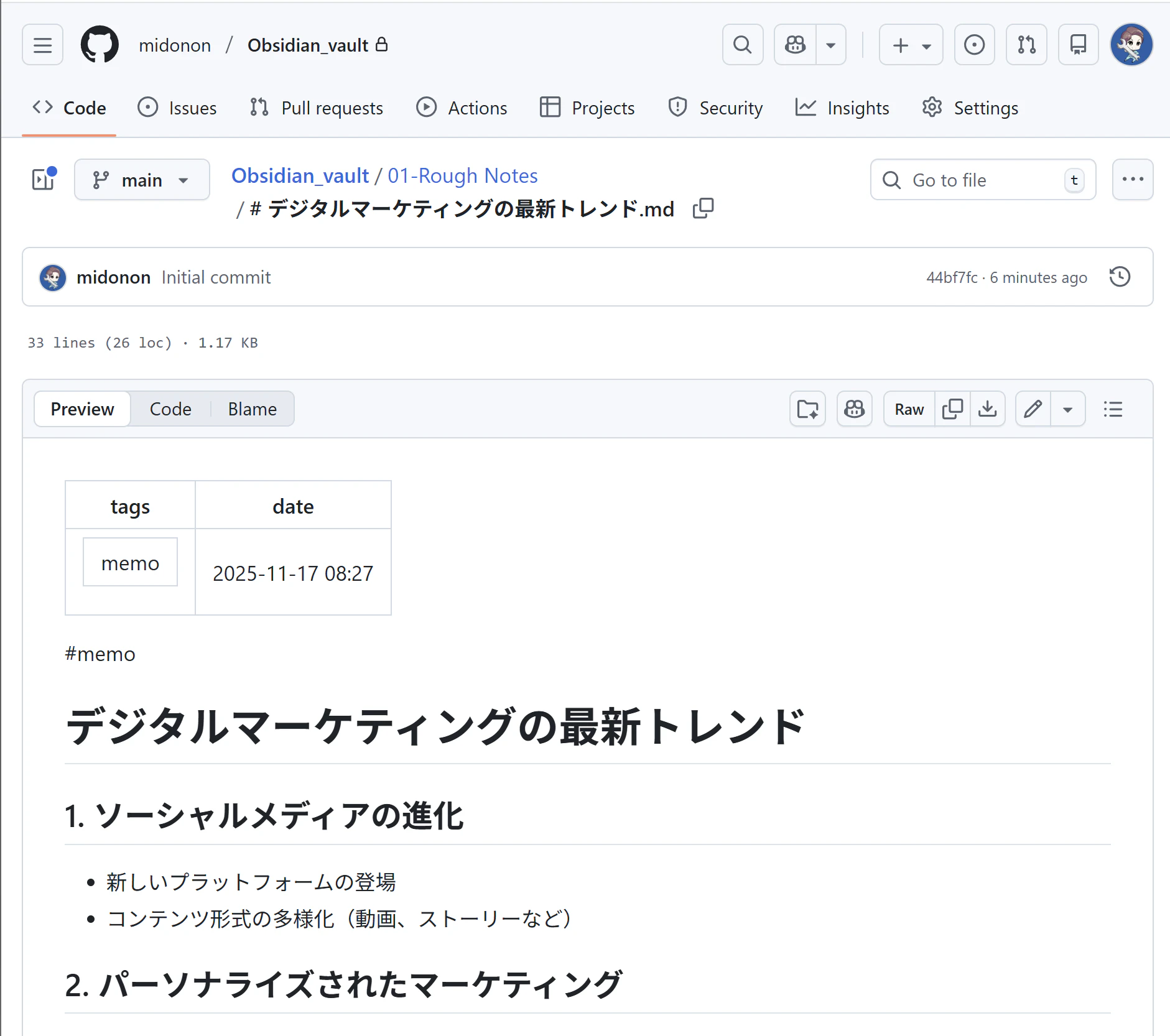 GitHub のWebでリポジトリを開いて、これまでのVaultの中身(.md ファイル)が見えることを確認しました。