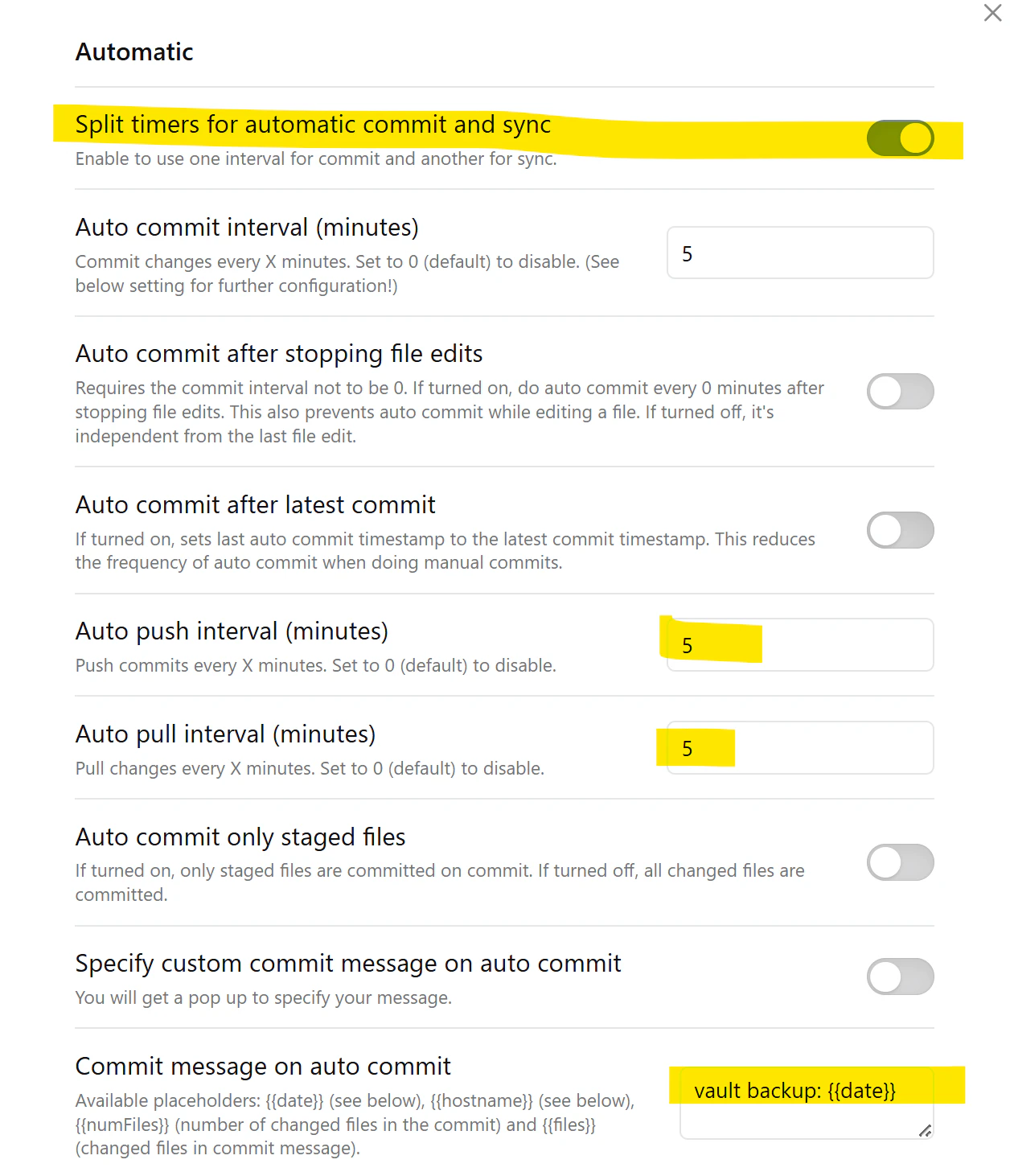 設定 → 「Git」タブで https://zenn.dev/harieshokunin/articles/5a827bee5d2355 を参考に以下で設定。これでObsidianを開いている間は、5分ごとに pull → commit → push が自動実行されます。