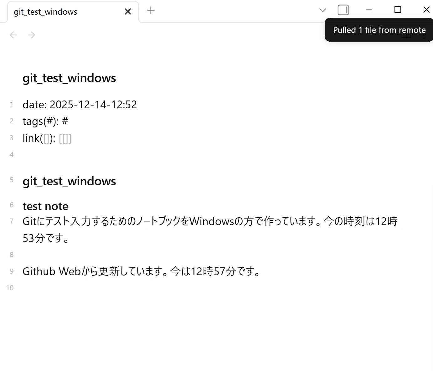 WindowsのObsidianで確認します。Obsidian を再起動すると起動時の Pull で更新されていました。