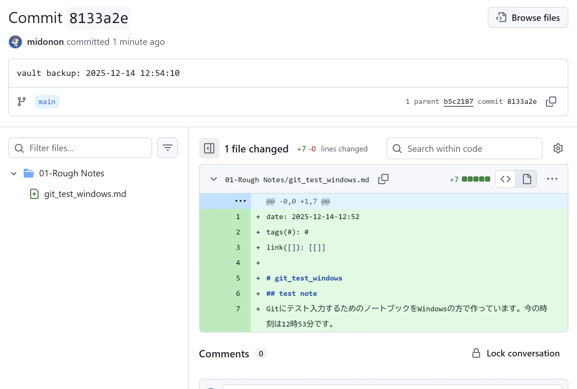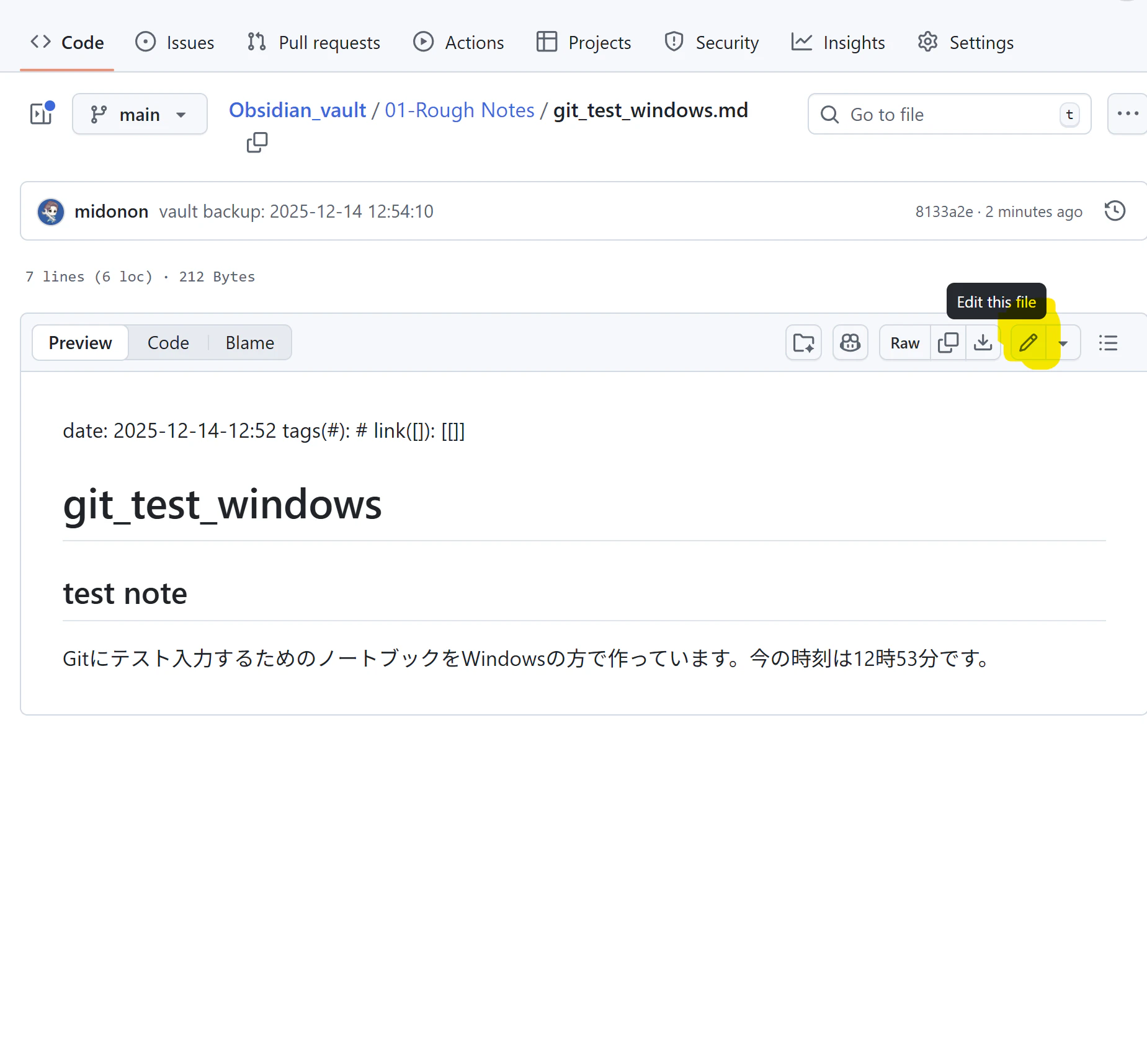 逆にGitHub 側で編集して、Windows Obsidian に反映されるかも確認します。