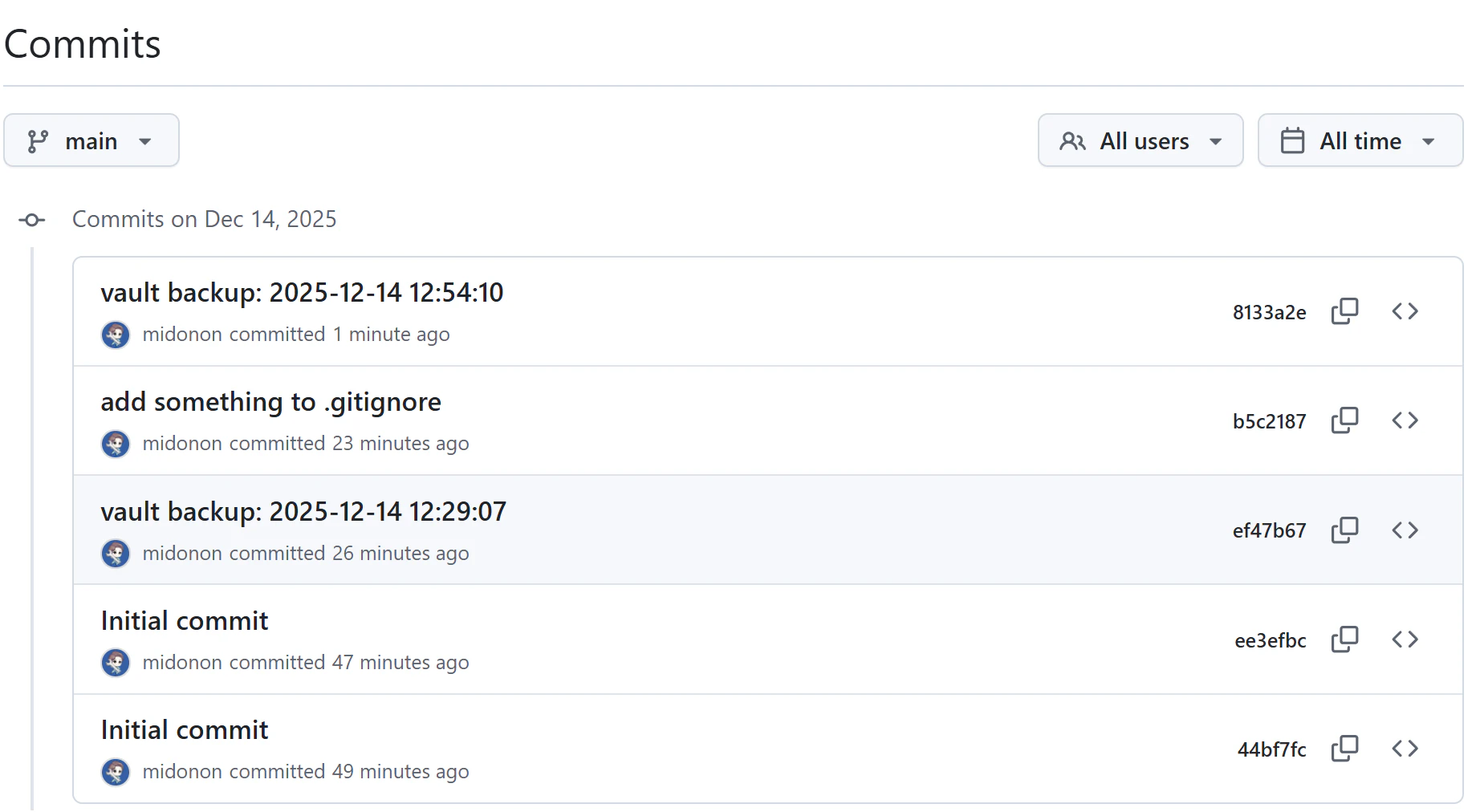 - 以後は Obsidian Git が一定間隔で自動同期(Pull / Commit / Push)