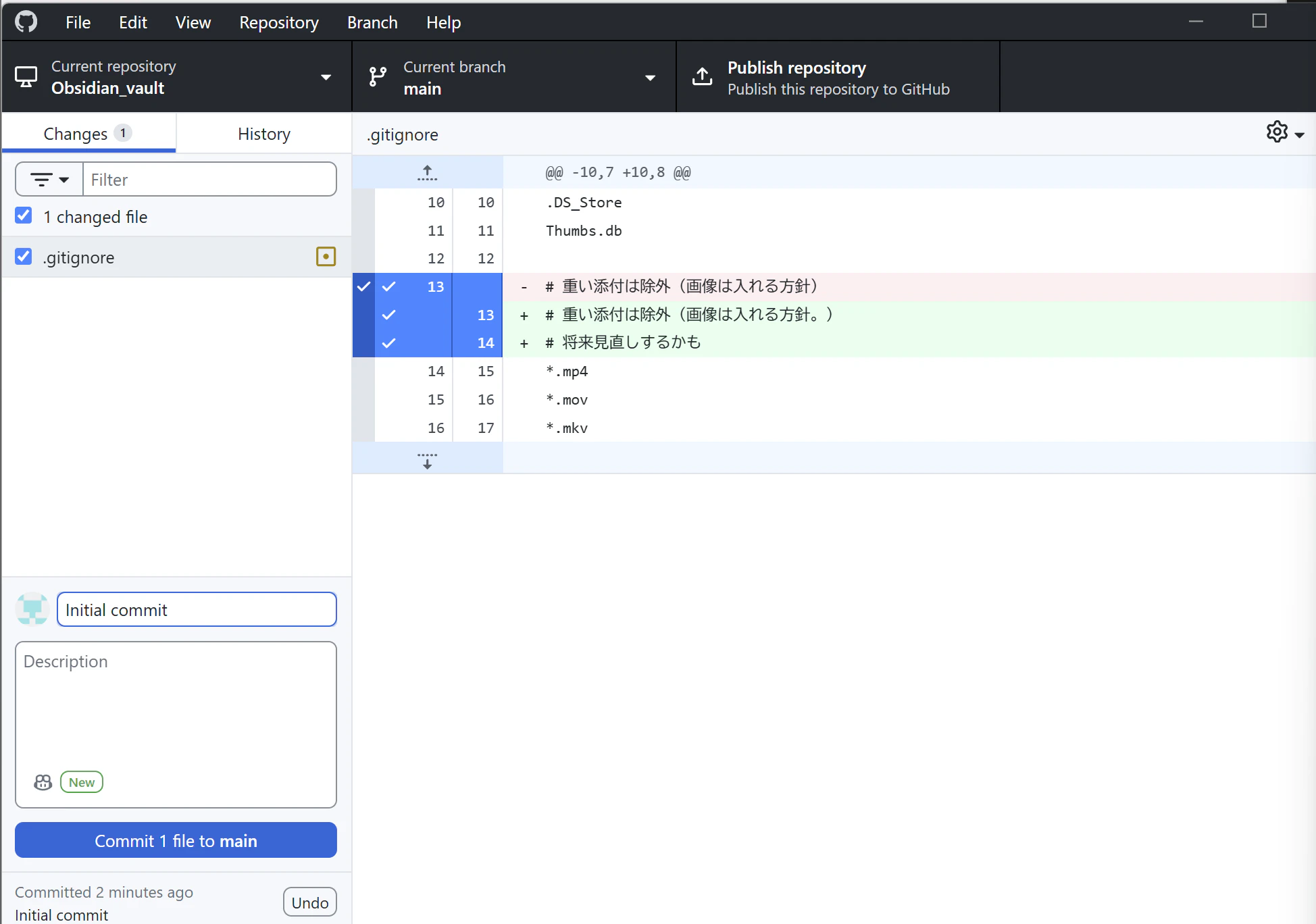 ここからは GitHub Desktop はほぼ使わず、Obsidian 側の自動同期が主役になります。