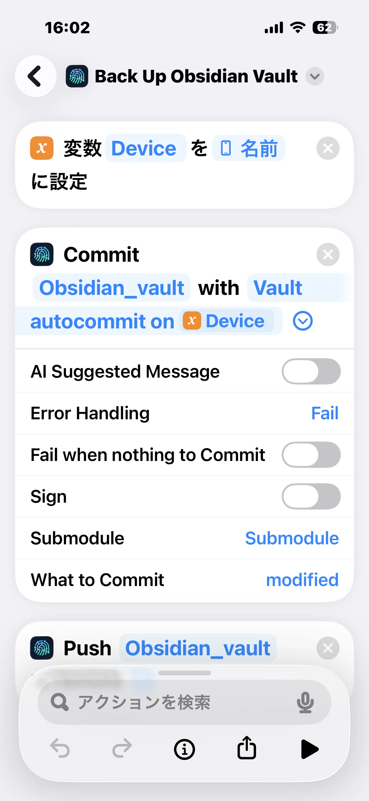 - iPhoneでObsidianアプリを開いたら自動でPull、閉じるときに自動でCommitとPushを実行する