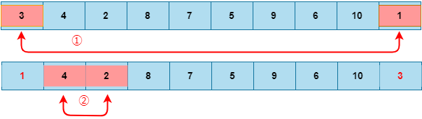 ①で最小値を見つけることができましたので、最小値とi番目と入れ替えていきます。