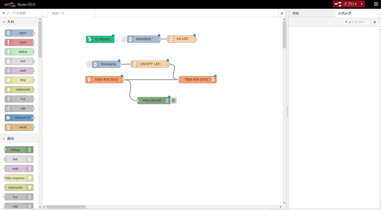 [{"id":"92e399cf.4e998","type":"tp-initialize","z":"da6502f5.d66bf8","name":"","make":true,"x":241,"y":77.5,"wires":[]},{"id":"6599e78b.988d4","type":"Tibbit-#38 in","z":"da6502f5.d66bf8","name":"","tpSlot":"S05","outputOnly":true,"communication":"GPIO","pinA":"IN_Edge","pinB":"other","pinC":"other","pinD":"other","connectedStatus":"start","host":"","x":258,"y":248.5,"wires":[["a95f40a.6f6f2c","2cf4499e.310166"]]},{"id":"2cf4499e.310166","type":"Tibbit-#39 out","z":"da6502f5.d66bf8","name":"","tpSlot":"S04","communication":"GPIO","pinA":"OUT","pinB":"other","pinC":"other","pinD":"other","connectedStatus":"start","host":"","x":654,"y":248.5,"wires":[]},{"id":"a95f40a.6f6f2c","type":"debug","z":"da6502f5.d66bf8","name":"","active":true,"tosidebar":true,"console":false,"tostatus":false,"complete":"false","x":468.5,"y":337,"wires":[]},{"id":"1b64f474.7764bc","type":"inject","z":"da6502f5.d66bf8","name":"","topic":"","payload":"","payloadType":"date","repeat":"","crontab":"","once":false,"onceDelay":0.1,"x":266,"y":183.5,"wires":[["84824c7c.9a8a1"]]},{"id":"84824c7c.9a8a1","type":"function","z":"da6502f5.d66bf8","name":"ON/OFF LED","func":"msg.payload = ~flow.get(\"flag\")||0;\nflow.set(\"flag\", msg.payload);\nreturn msg;","outputs":1,"noerr":0,"x":452,"y":182.5,"wires":[["2cf4499e.310166"]]},{"id":"d5b11be7.b2a1c","type":"inject","z":"da6502f5.d66bf8","name":"","topic":"","payload":"","payloadType":"date","repeat":"","crontab":"","once":true,"onceDelay":0.1,"x":425,"y":76.5,"wires":[["f335f79a.5f7098"]]},{"id":"f335f79a.5f7098","type":"function","z":"da6502f5.d66bf8","name":"init LED","func":"flow.set(\"flag\", 0);","outputs":1,"noerr":0,"x":586,"y":76,"wires":[[]]}]