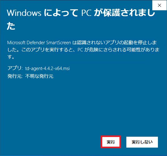 MSI インストーラーを起動します。Microsoft Defender SmartScreen に起動が妨げられた場合は、[詳細情報] リンクをクリックします。[実行] ボタンが現れるので、[実行] ボタンをクリックします。
