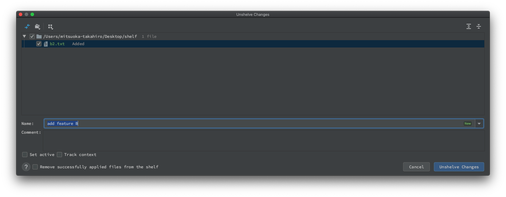 Shelfタブのadd feature Bを右クリック、Unshelve...を選択します。