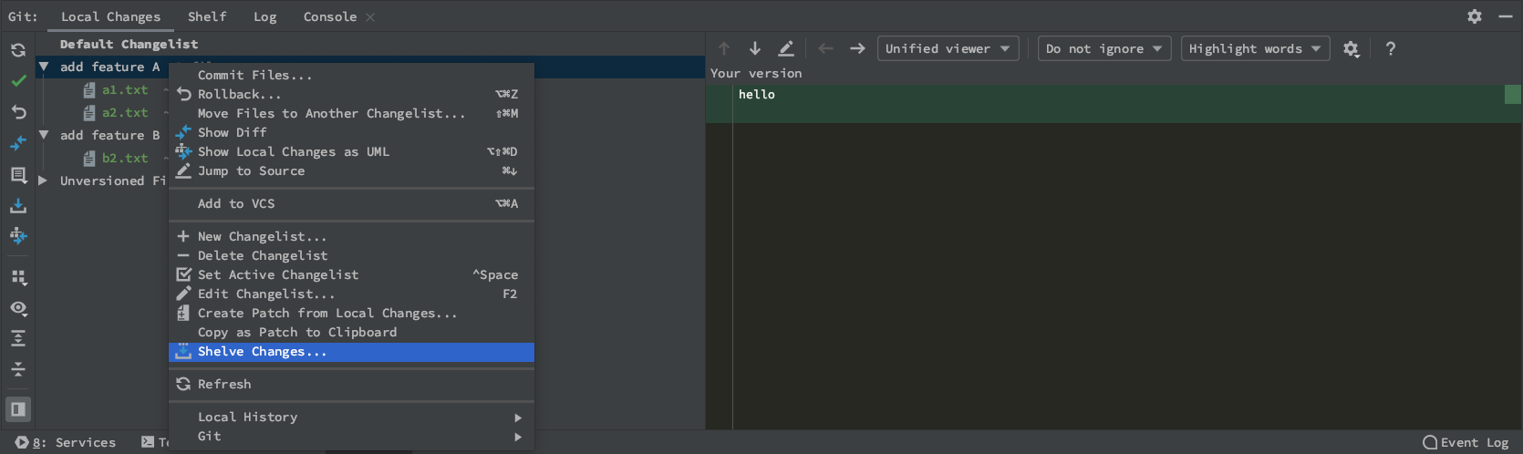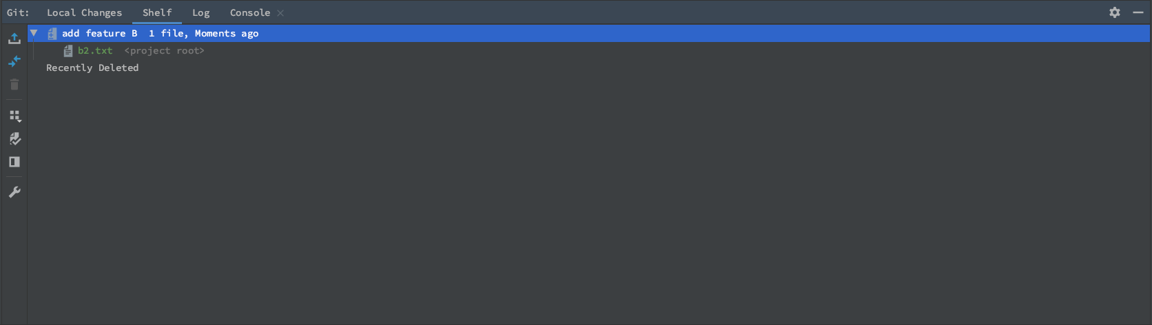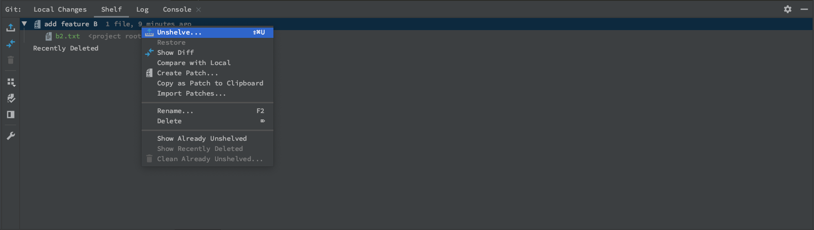 Git ツールウィンドウでb2.txtを右クリックし、Shelf Changesを選択します。