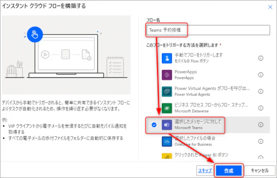 フロー名を入力し、トリガーに Microsoft Teams の [選択したメッセージに対して ] を選択して、[ 作成 ] をクリック