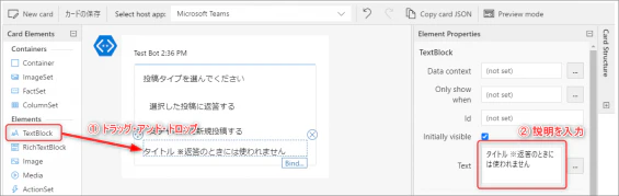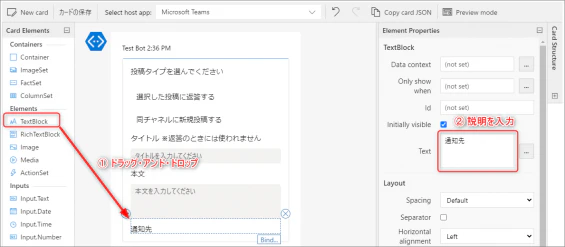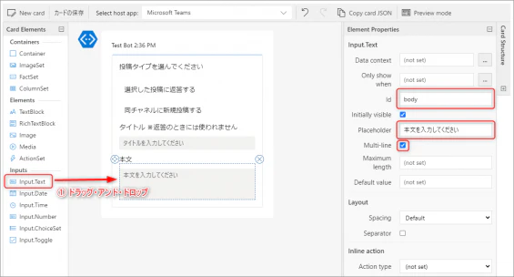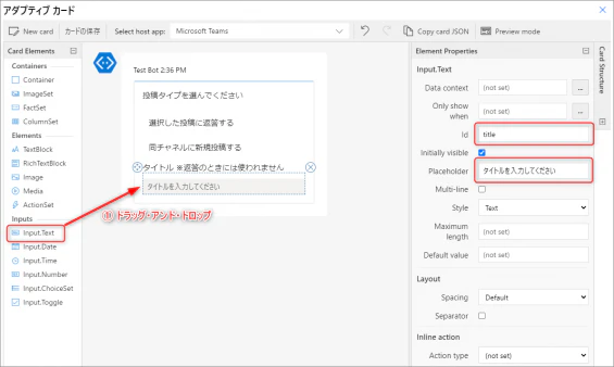 - Input.Time を AdaptiveCard にドラッグ・アンド・ドロップし